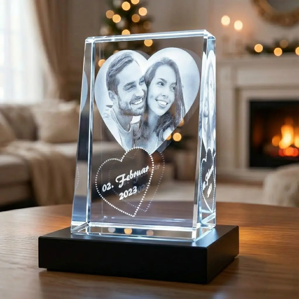 Halte deine besonderen Momente in einem eleganten Kunstwerk fest. Unser personalisiertes Fotogeschenk im Hochformat überzeugt durch detailgetreue Gravur in klarem Kristallglas. Das selbststehende Design macht es ideal für jede Präsentation auf Regal, Kommode oder Nachttisch. Das selbststehende Design mit optional erhältlichem LED-Leuchtsockel das Glasbild zusätzlich aufwertet und beeindruckende Reflexionen erzeugt.