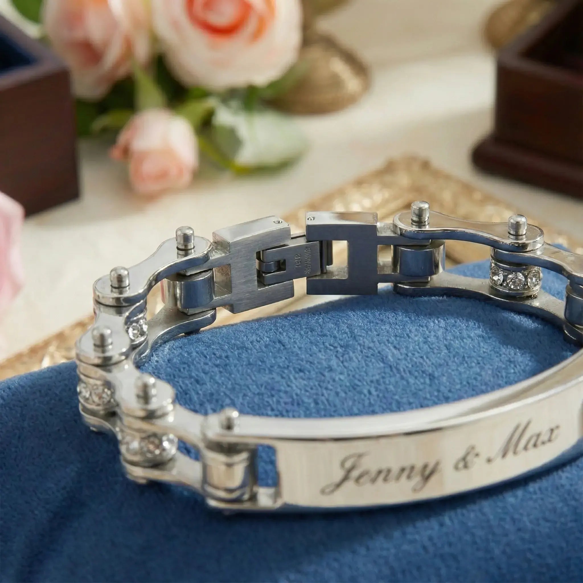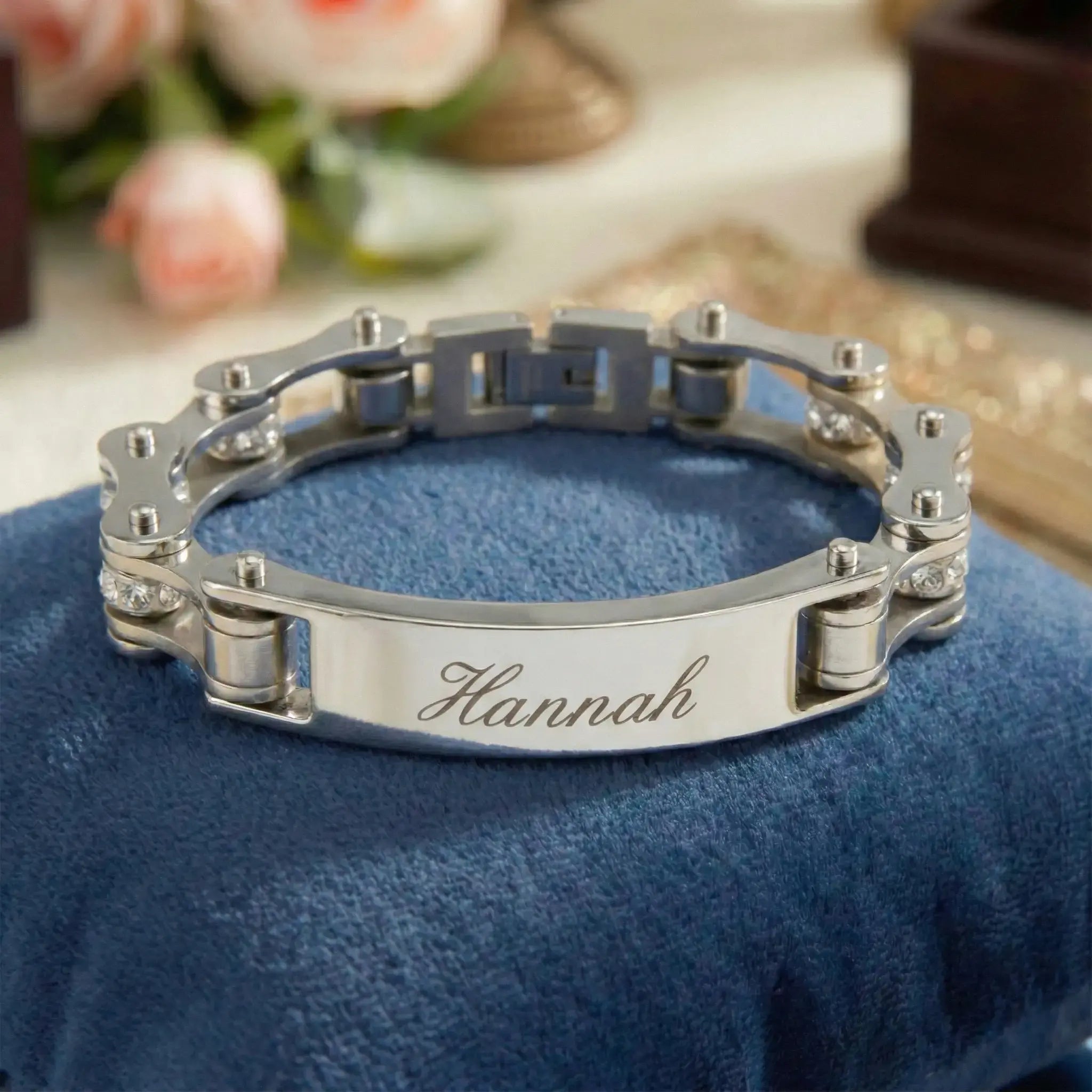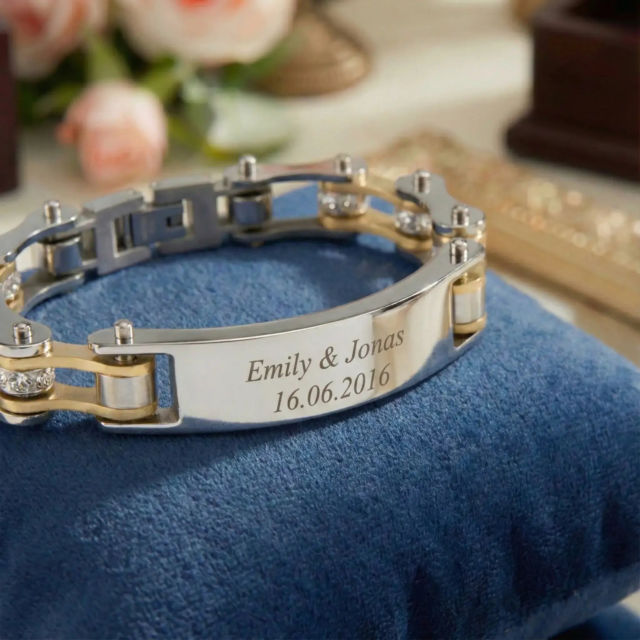Stilvolles Biker-Armband mit individueller Gravur. Dieses elegante Biker-Armband kombiniert ein modernes Design mit der Möglichkeit einer individuellen Gravur. Mit funkelnden Strasssteinen und einer robusten Kettenglieder-Optik ist es das perfekte Accessoire für Damen, die ein einzigartiges Schmuckstück suchen. Ideal als Geschenk oder für den eigenen Stil.
