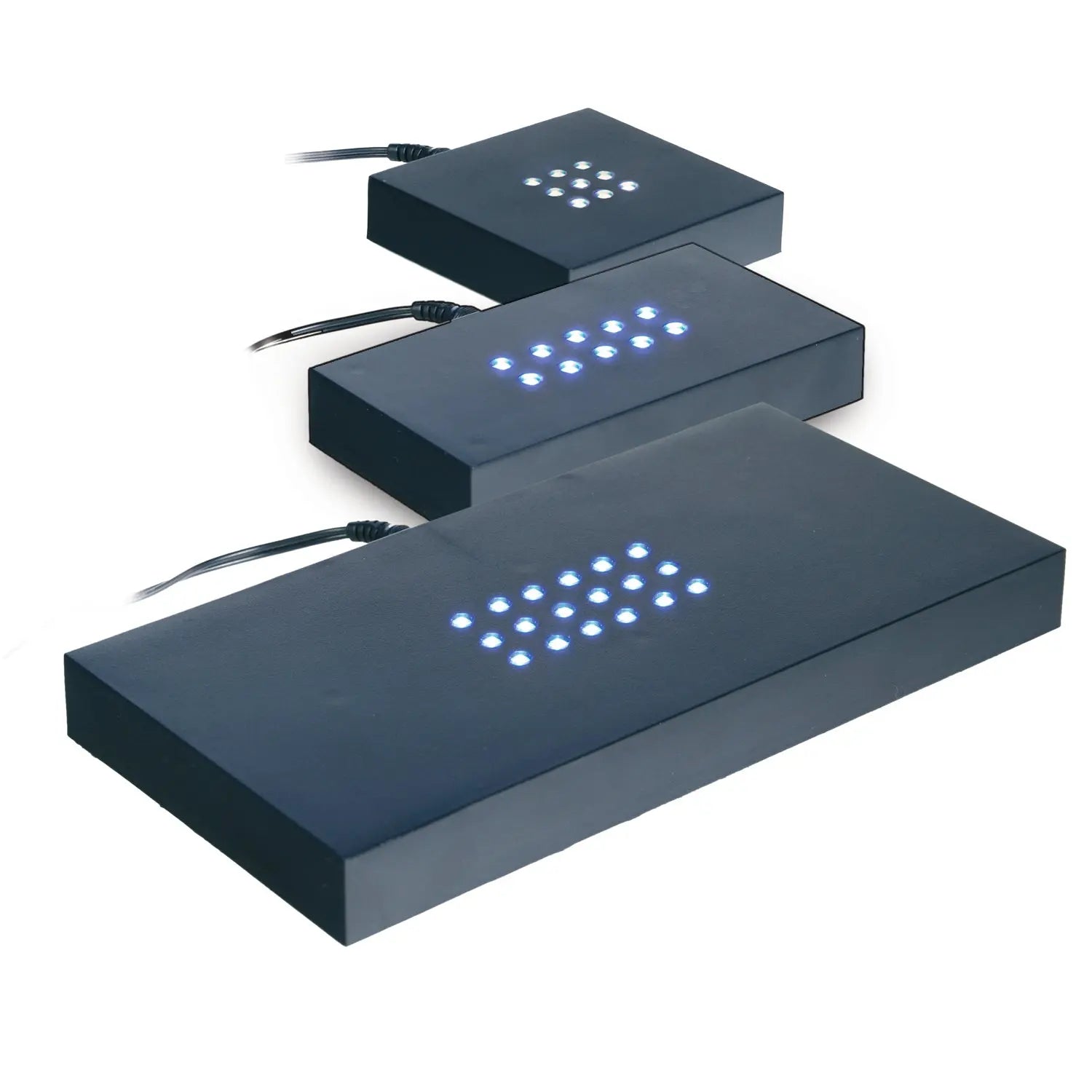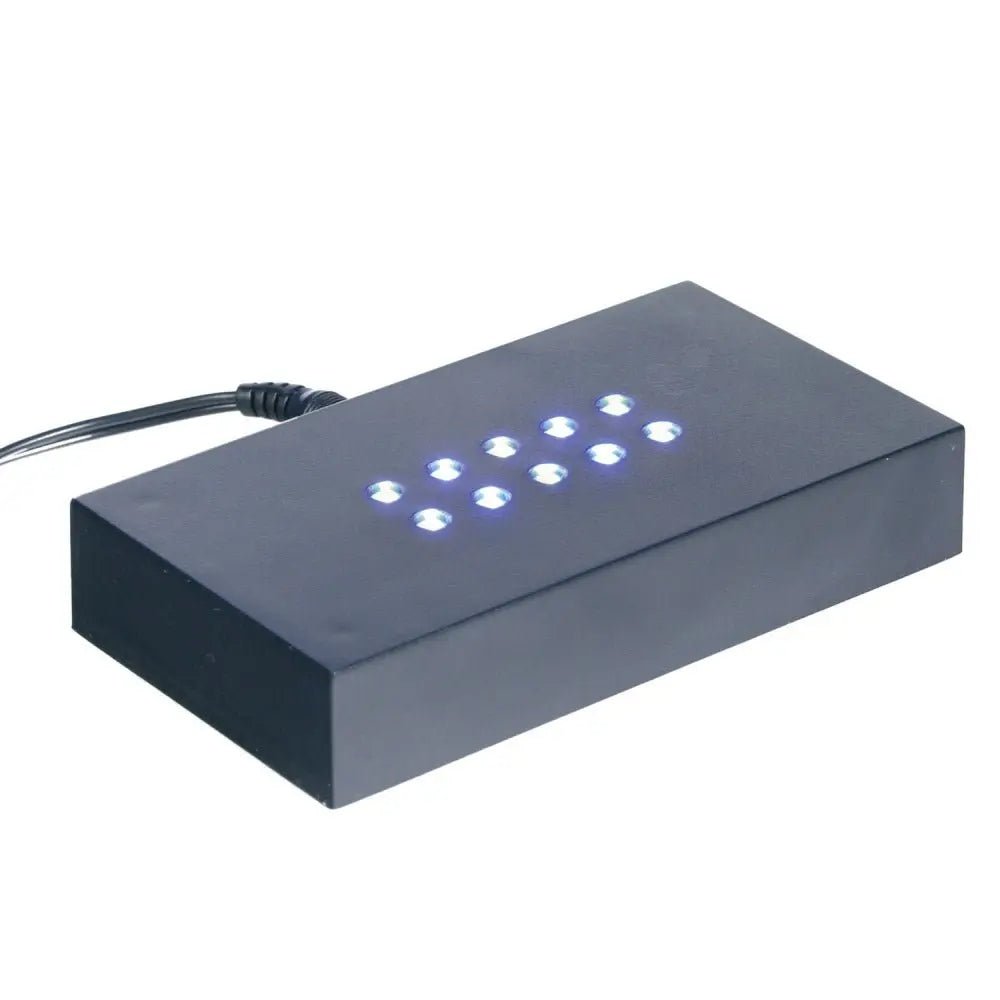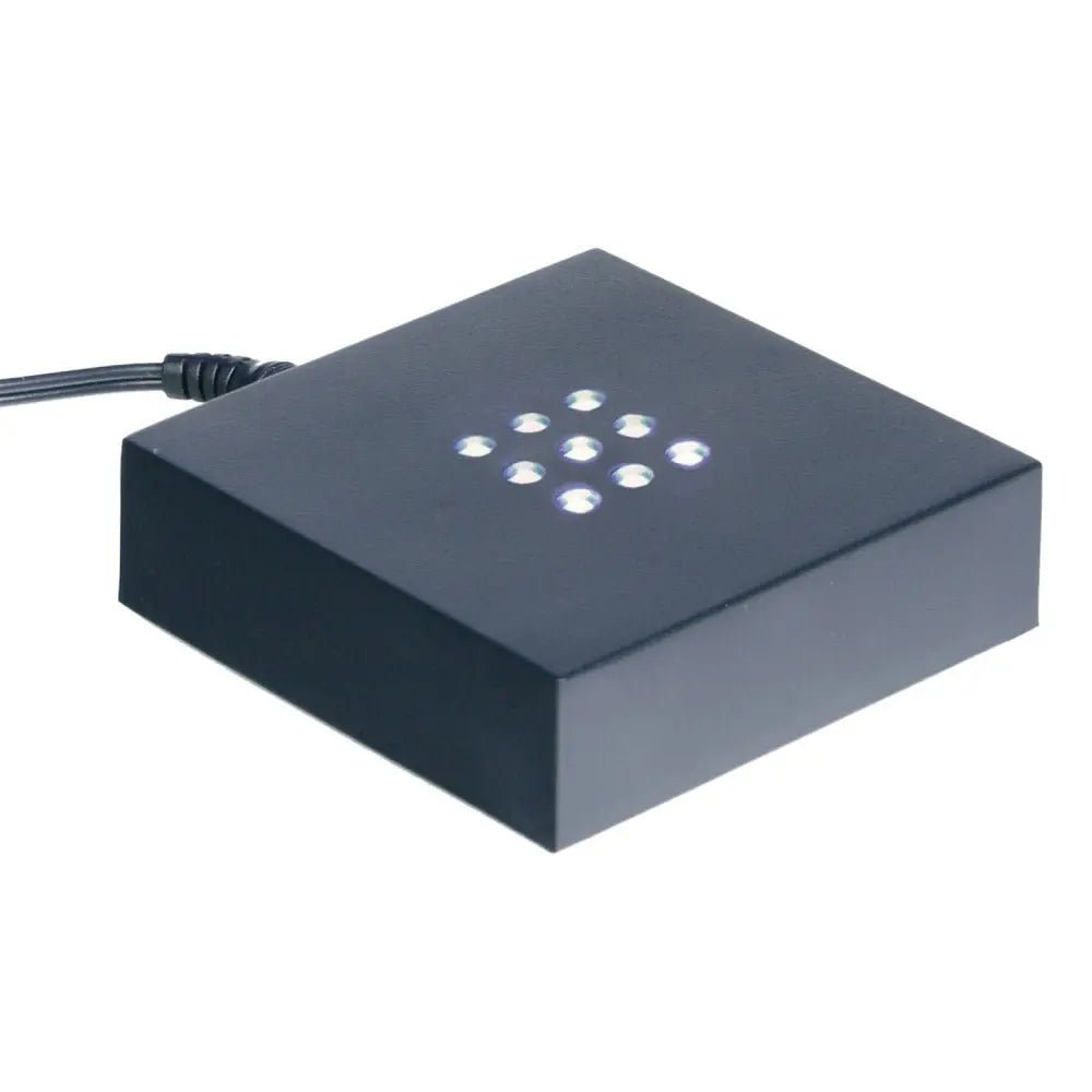 Ein Glasblock mit Laserinnengravur präsentiert Fotos auf besonders kunstvolle Weise. Durch einen Leuchtsockel wird der Effekt verstärkt, was besonders wirkungsvoll in weniger ausgeleuchteten Regalen ist. Das natürliche, elegante Licht des Sockels verleiht dem Bild eine ansprechende Ästhetik und schützt mit seinem Samtbezug Möbel vor Kratzern.